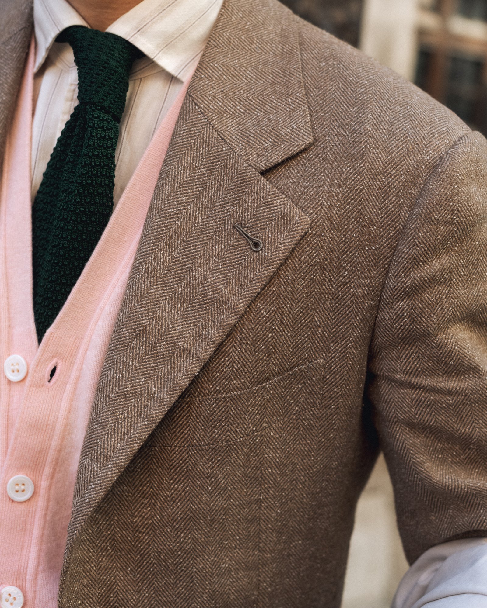 With raw materials come from a specific part of Normandy and a collection usually woven by expert hands in Italy, this unique number takes a different turn. A silk–linen blend woven in a Donegal effect, it carries a flecked, tactile surface balanced by a smooth, refined handle. To stay true to the project, this cloth is woven in Donegal itself—making it a genuine rarity.