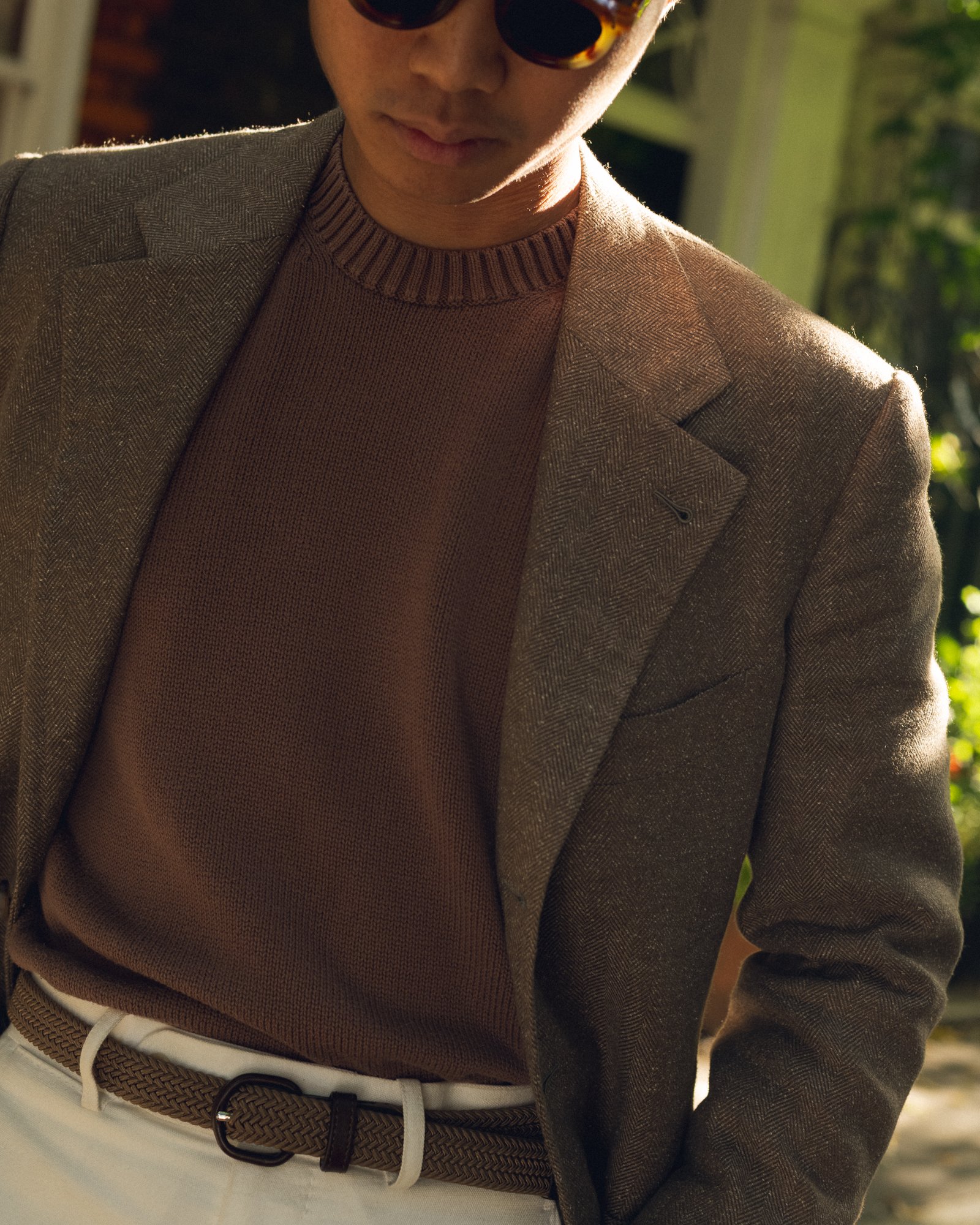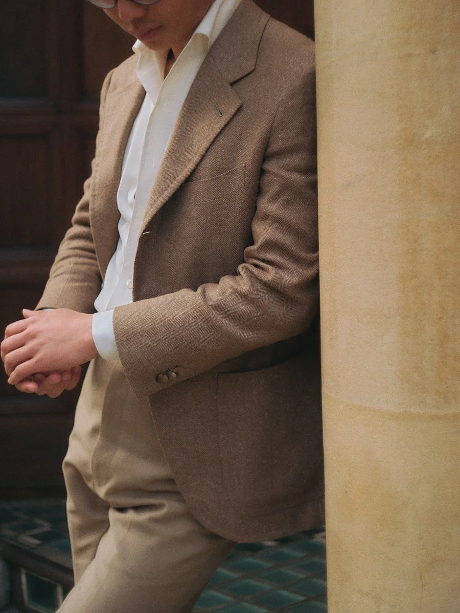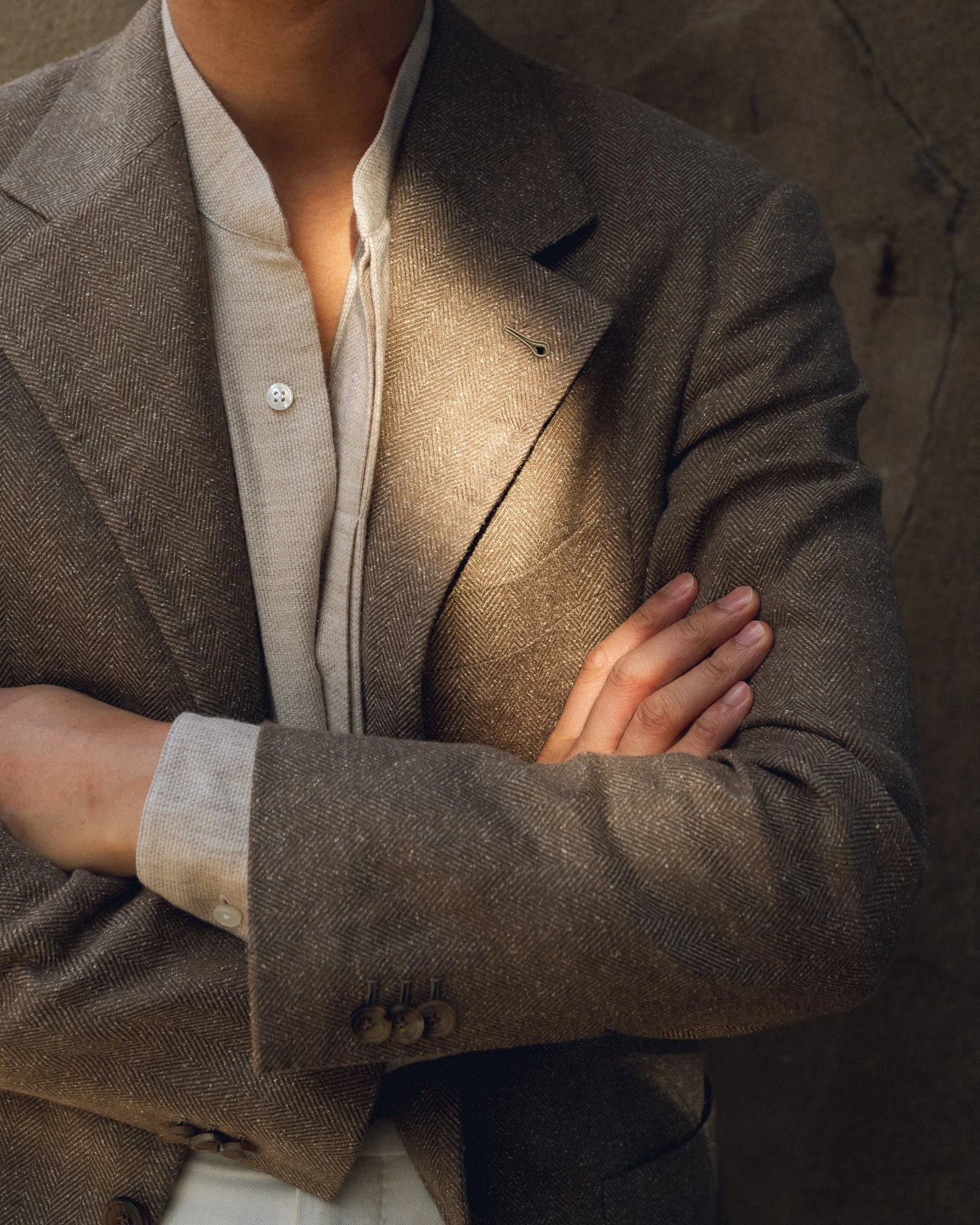 Flecked and textured, it sits between worlds: not quite Donegal, not quite raw silk, and richer for it. The result is a linen–silk sport jacket in a muted camel tone—quiet, assured, and anchored in the strength of neutrals.
