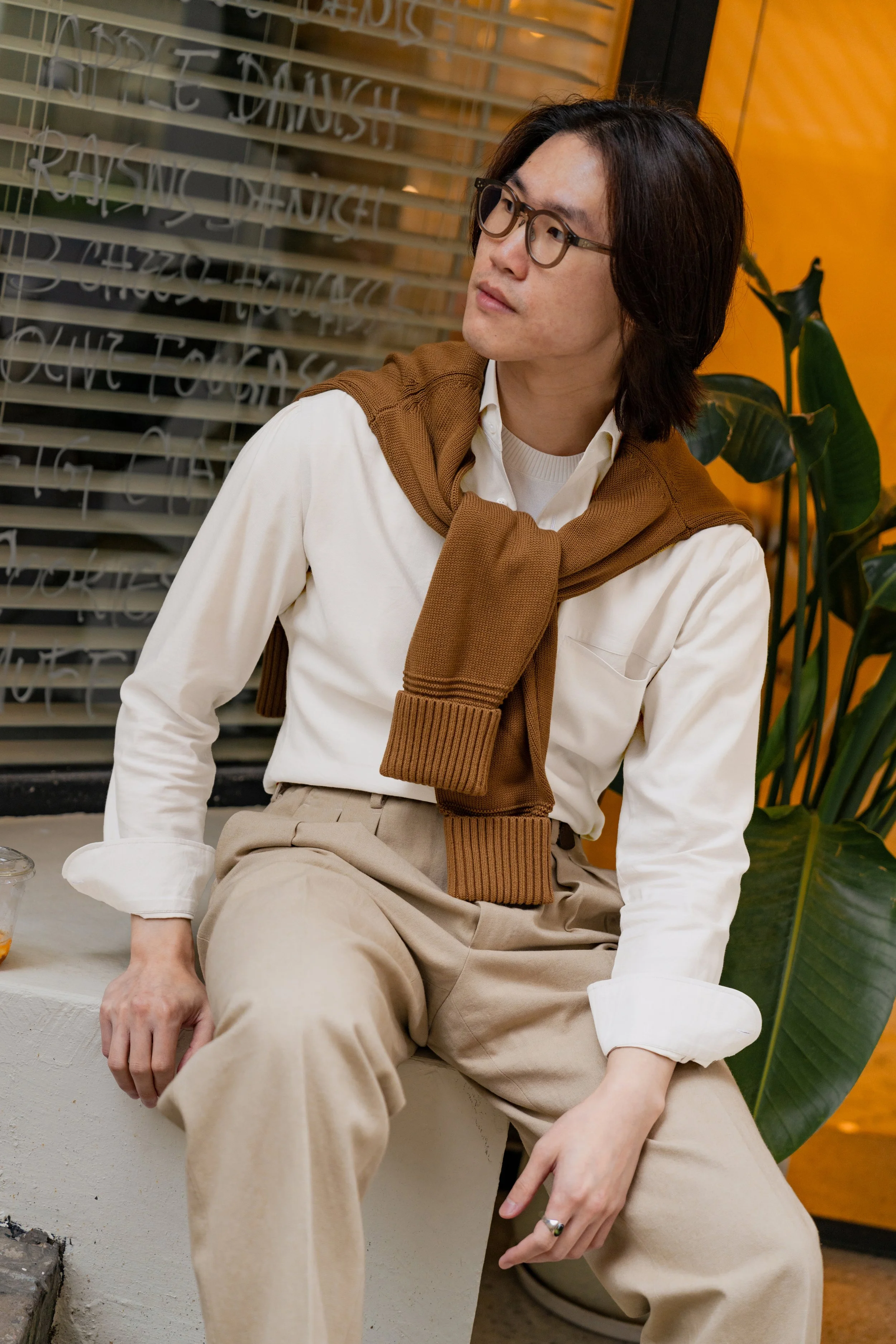 The wear experience is a vital part of the narrative with most fine clothing, but this series in particular. Woven from pure cotton with a brushed finish, blended with Australian merino for warmth and body, and a delicate touch of silk for that quietly luxurious edge. The result is fluid, breathable, and remarkably smooth against the skin. The silk lends a subtle tactile hand and aids in moisture control, while the merino rounds it off with comforting warmth. It’s a textile composition chosen for both elegance and pleasure. But the most remarkable thing about this is the weight of the cloth. It is lightweight, unliked any other brushed cotton shirts that at are designed for colder seasons, this is quite genuinely the all-year-round piece.