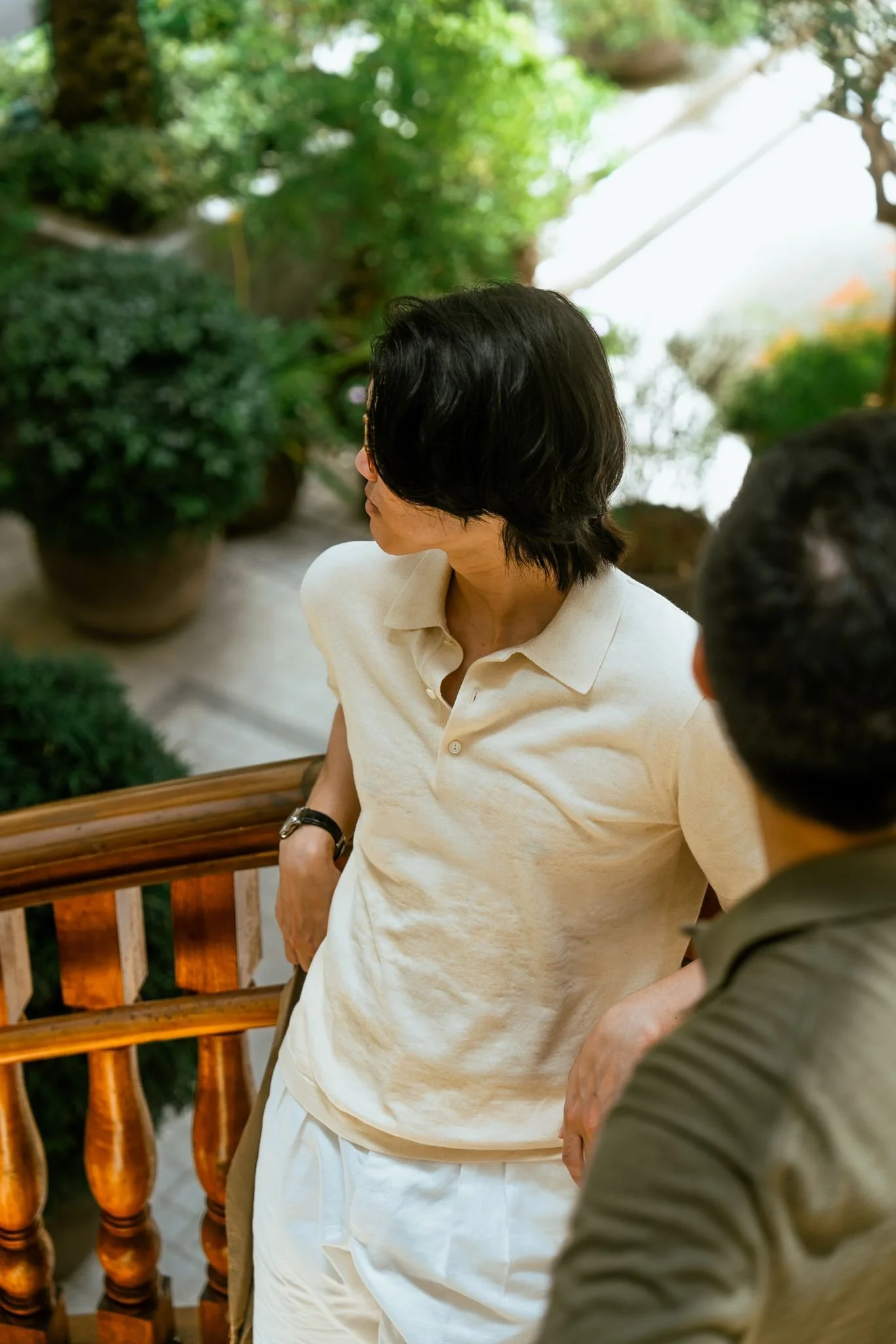 This new polo, however, is a different kettle of fish. Starting with the silhouette, our design features longer sleeves and a straighter cut through the body, but loose at the ends. Unlike our iconic knitted t-shirts’ ribbings that hug the arms, this one is louche and airy, creating an illusion with the squared end of the sleeve. The second notable feature is the abbreviated cut on the body. Drawing on our bespoke tailoring prowess, we studied various physiques across ages and ethnicities to discover the 'golden standard' — a perfect length that allows the polo to be worn tucked or untucked with equal elegance.