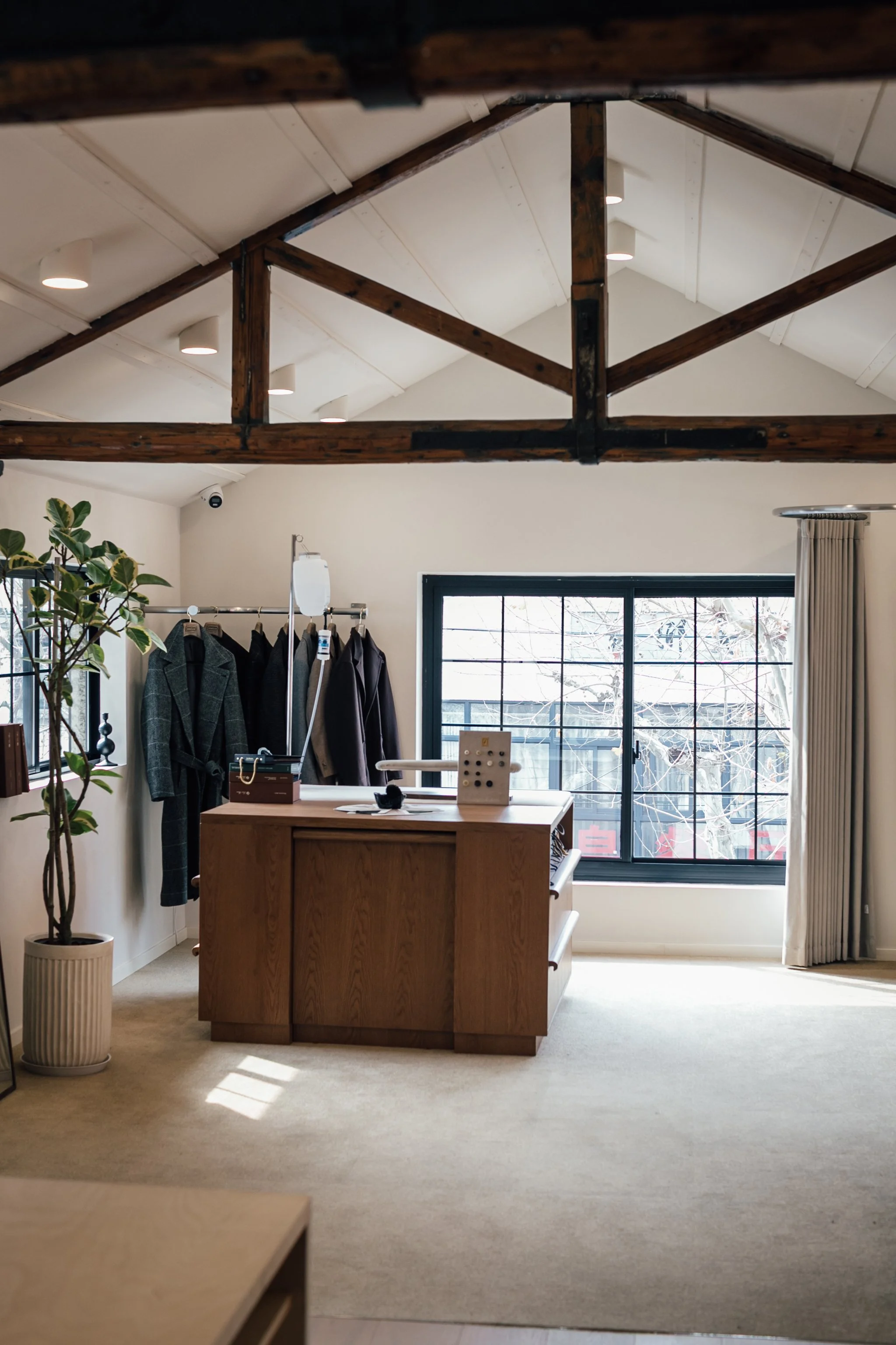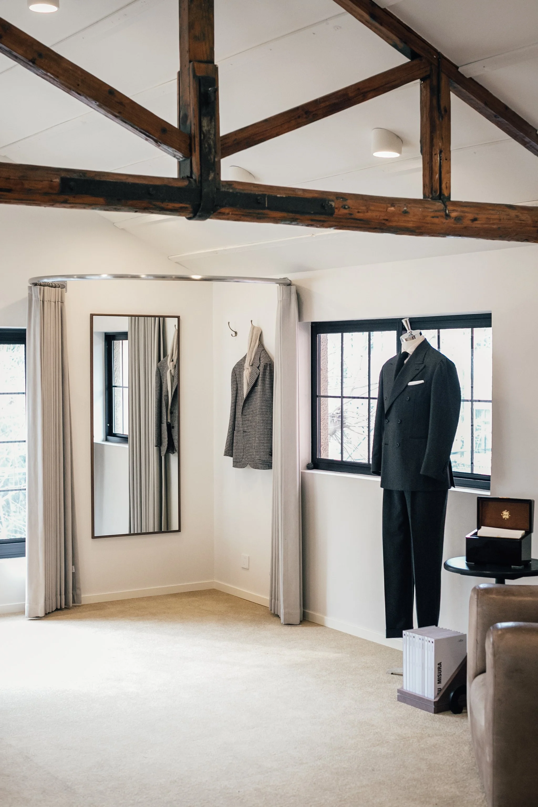 The Attic serves as the home of our custom tailoring, where garments are shaped through dialogue and process, and the heart of what we do at The Anthology. Seating is arranged to encourage ease, and the room’s openness allows focus without formality. From here, one can look out over the street below, observing the city at a distance while remaining removed from its pace.
