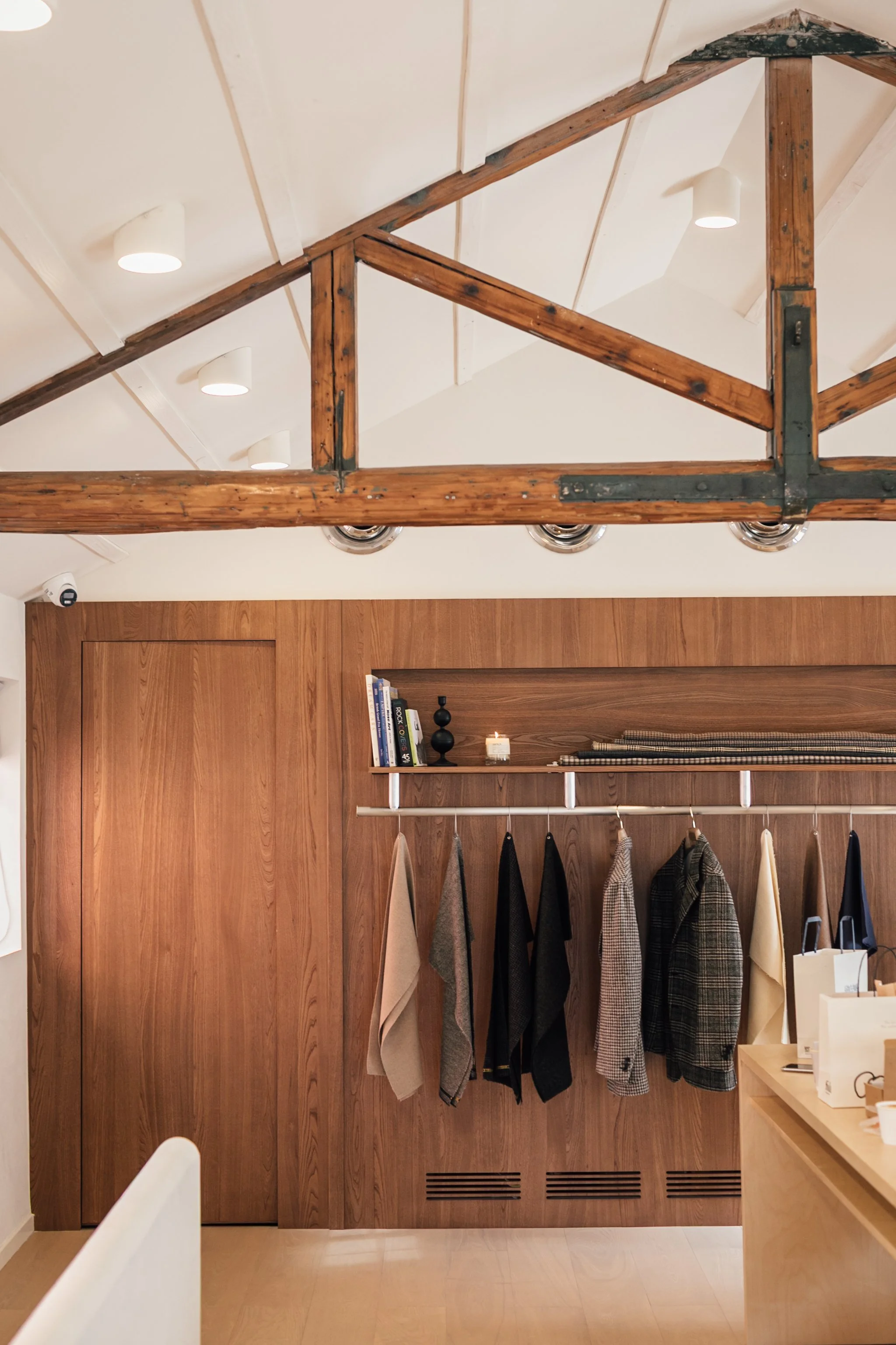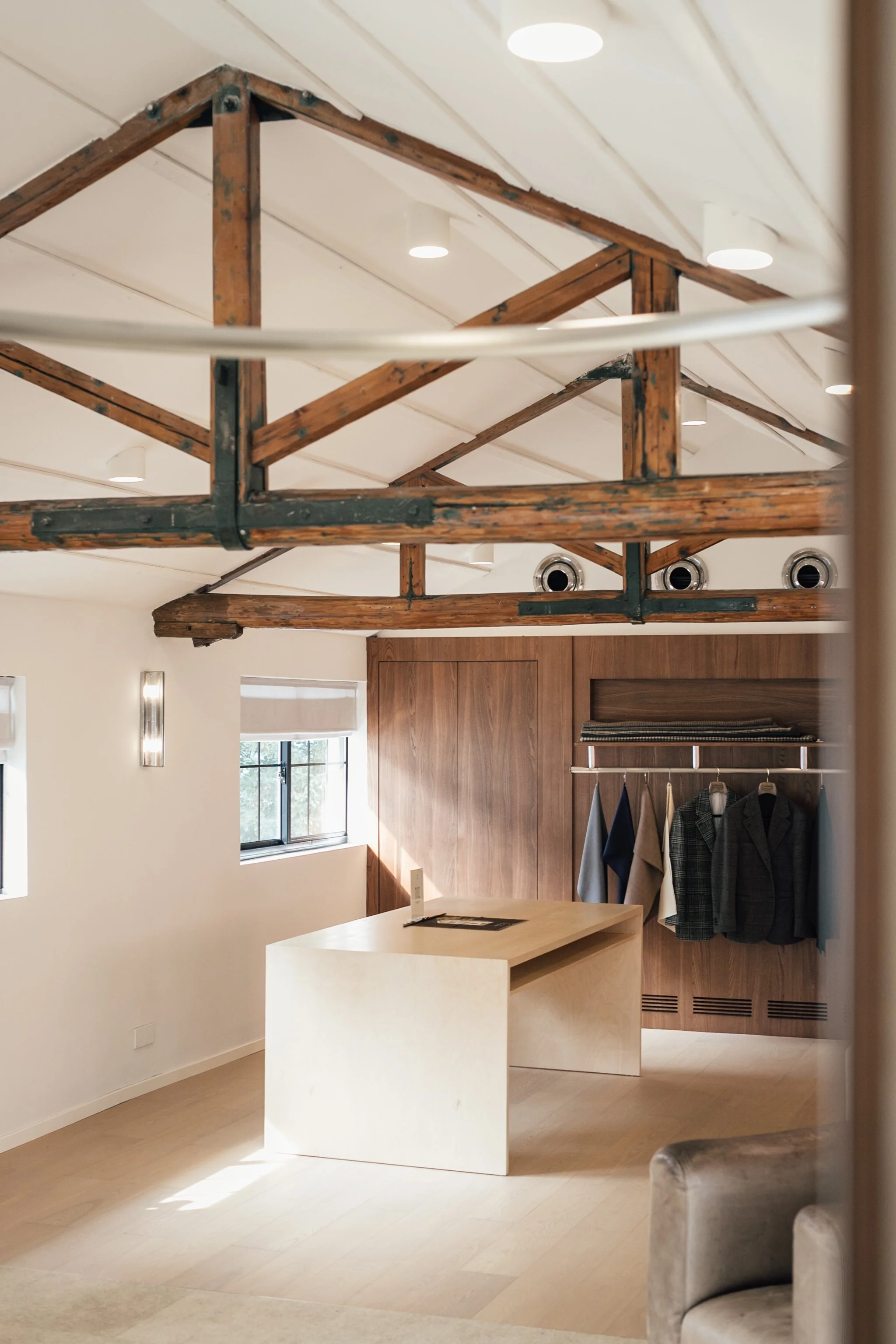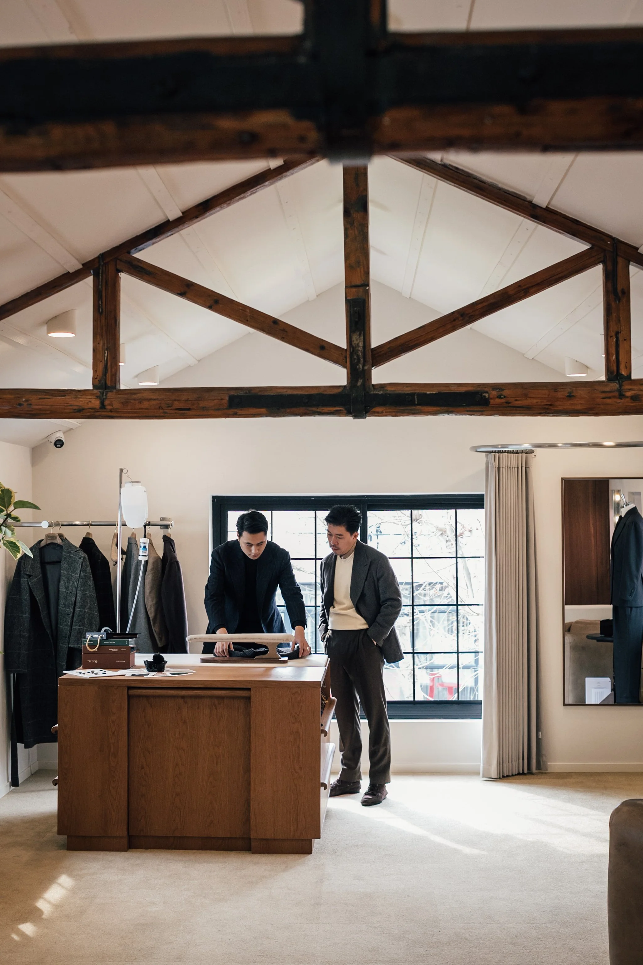 Natural light enters softly, filtered through the structure of the roofline, while the proportions of the room invite pause rather than passage. This is a place designed for conversation — for fittings that unfold over time, for ideas to be exchanged, refined, and revisited. The atmosphere mirrors that of The Anthology’s Hong Kong showroom and Taipei store, continuing our shared language across cities.