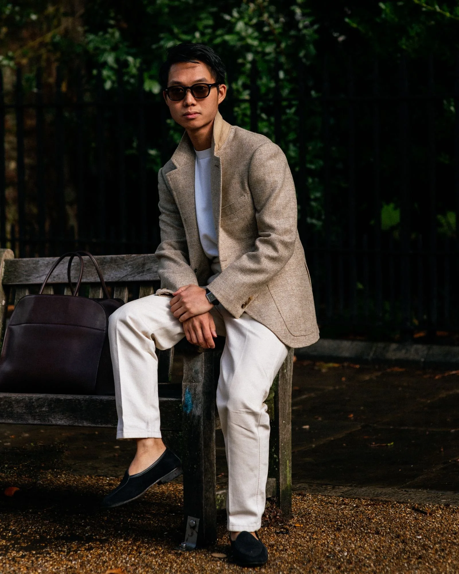 People often forget the change of weather comes gradually, not all of a sudden. Layers come in time as if they are slices of Lasagne sheets. Beginning with an undershirt or our white knitted t-shirt where we covered our transeasonal styling earlier on, dressers can style the sport jacket with our heather grey long sleeve polo before the cashmere jumper as Simon demonstrated. Chinos as opposed to denim, albeit suitable, we also recommend our Civilman trousers to pair as the in-between, especially olive for all-year-round use, or brown moleskin when peak winter comes.