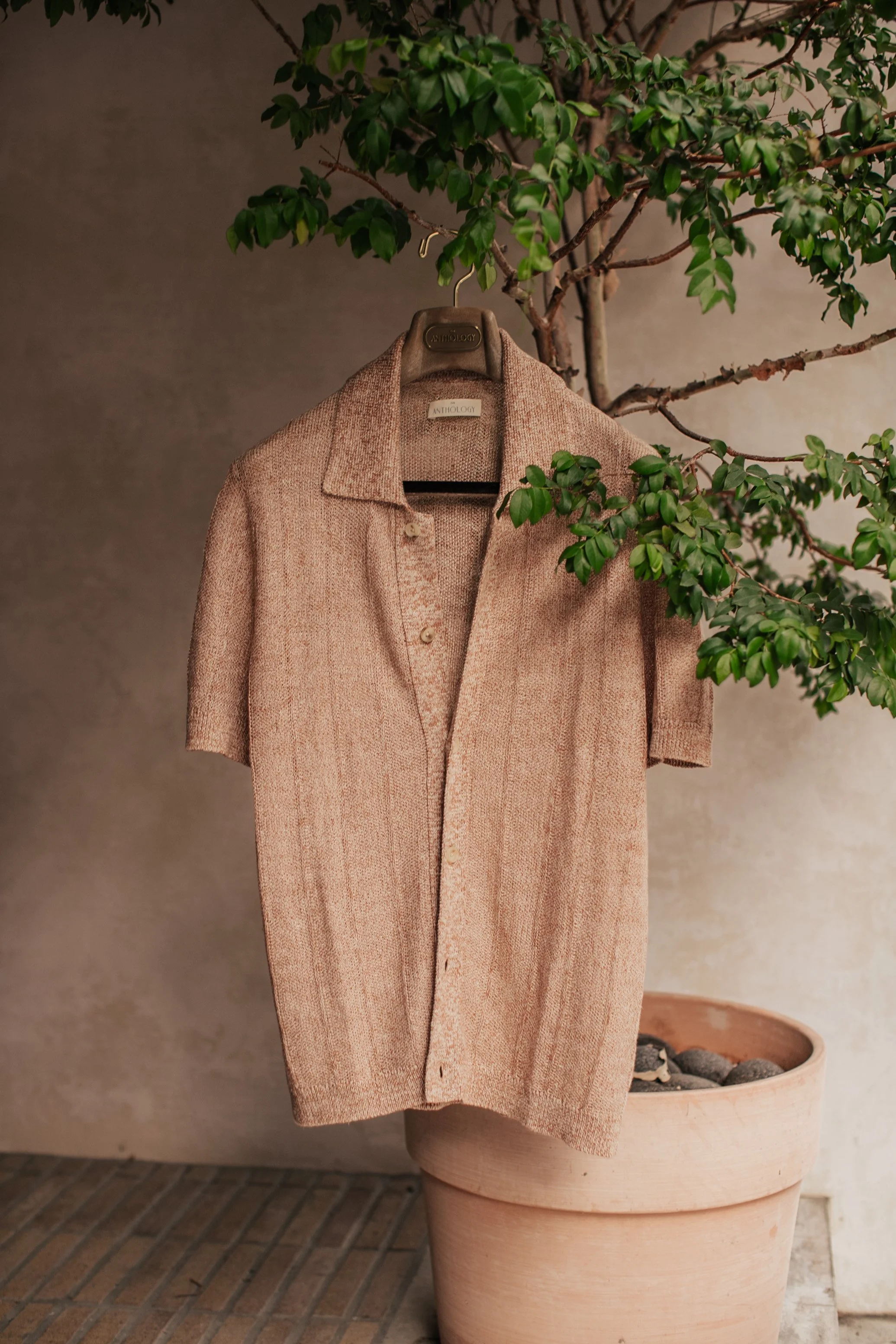 So where does our Knitted Shirt fit into this spectrum? If the Freeman Popover is the go-to travel shirt—practical, versatile, and easy—while the towel-cloth popover conjures visions of post-swim leisure (albeit more fantasy than routine), then the Knitted Shirt in Rosso Travertine occupies a compelling middle ground. It is both of these and neither at the same time.