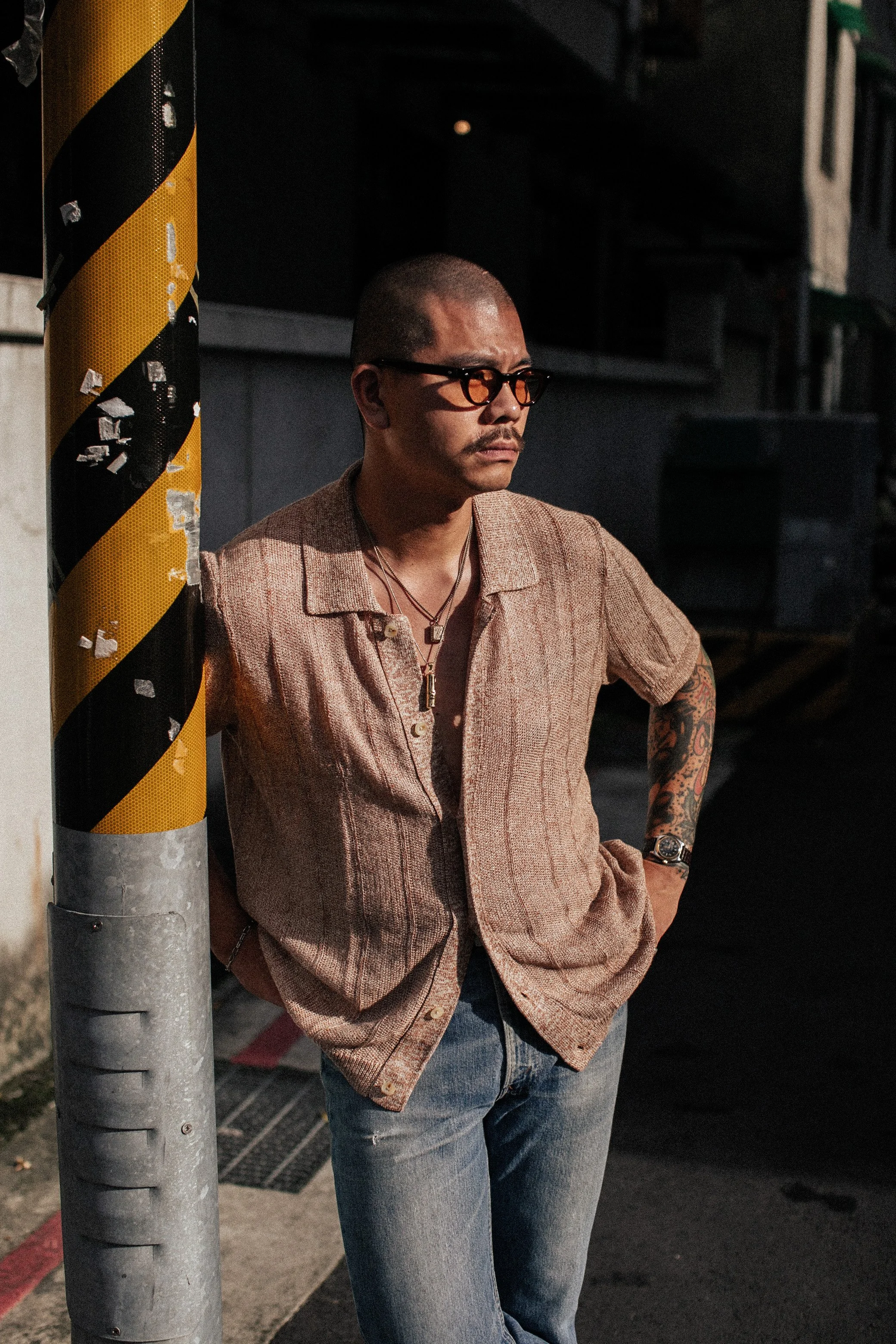 In our Knitted Shirt, this manifests as a melange of yarns—red, white, and limestone yellow—that echo the stone’s tonal interplay. Linen’s natural crispness enhances the effect, giving the fabric a dry handfeel that mirrors the tactile authenticity of travertine. The result is a fabric that doesn’t just mimic stone visually but channels its spirit: grounded yet vibrant, timeless yet alive.