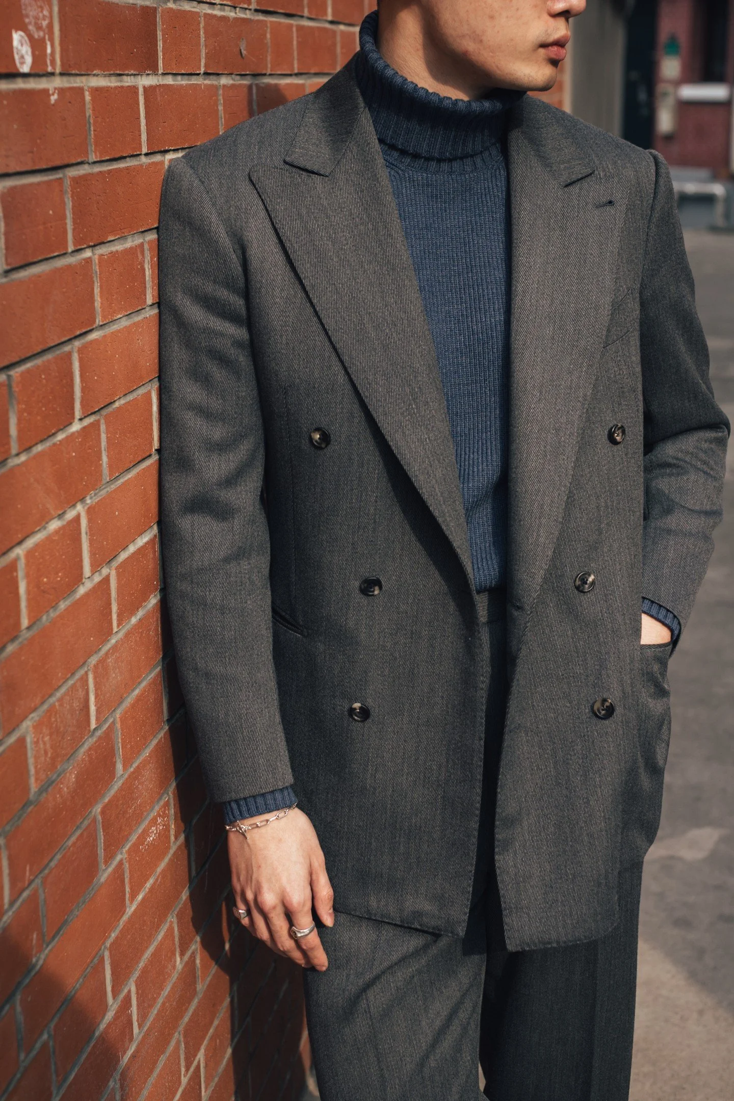 With the absence of ‘I am superior’ or ‘I speak of a certain look and era’ especially from the shoulder line, the ‘A’ Wrap Coat is interestingly quite the casual elegant design despite the reimagined and repurposed choice of textile in cavalry twill, where traditional heavily structured military coats also used. A powerful single or double-breasted suit underneath with signatures roped shoulders would best draw attention to the distinction between the two, but the juxtaposition is well harmonised, and it is just right. At the end of the day, we are still working within the fine lines of soft tailoring.