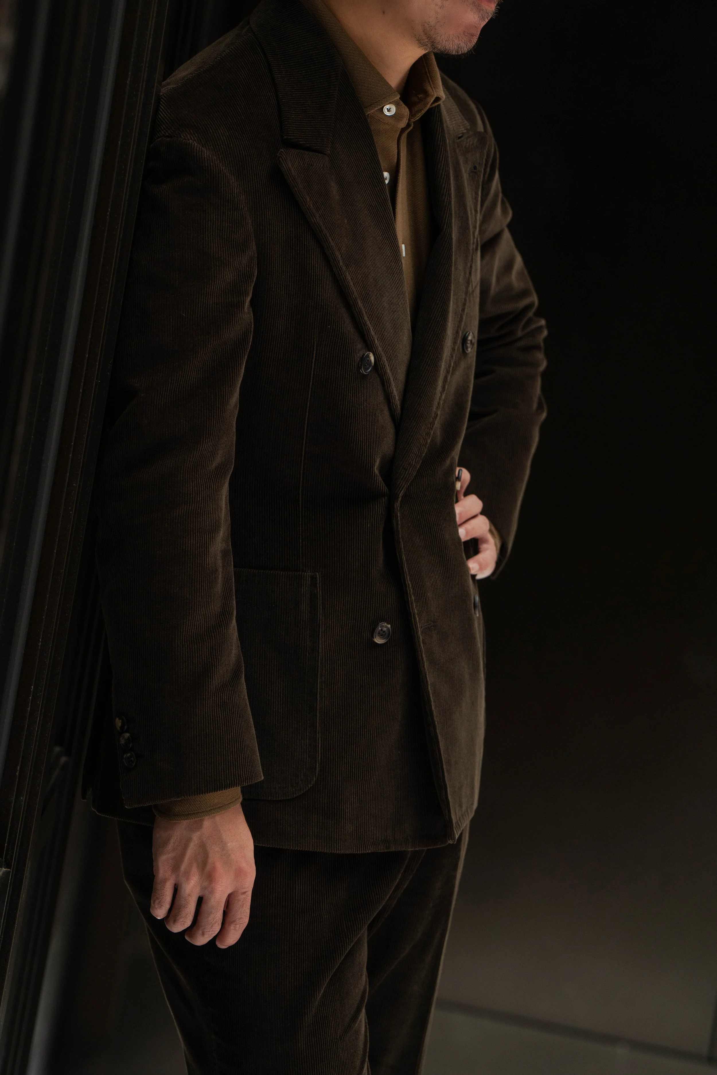 When the colour card of this creation was revealed to an Anthologist, a dear friend of the house, Mr. CK—an art museum curator specialising in 18th and 19th-century drawings—he remarked, ‘I perceive the essence of caviar, yet it echoes the hues of spruce’. The naming of this piece was a subject of much deliberation amongst our creators. The colour, the pièce de résistance, boasts an iridescent blend of brown and deep olive green, transforming with the play of light and shadow, akin to a chameleon. In varying lights, it reveals a spectrum of hues. Corduroy, synonymous with daytime country pursuits, also becomes evening-appropriate with its finer wale and captivating colour, lending itself to dinner dates or relaxed Sunday roasts, depending on the pairing.