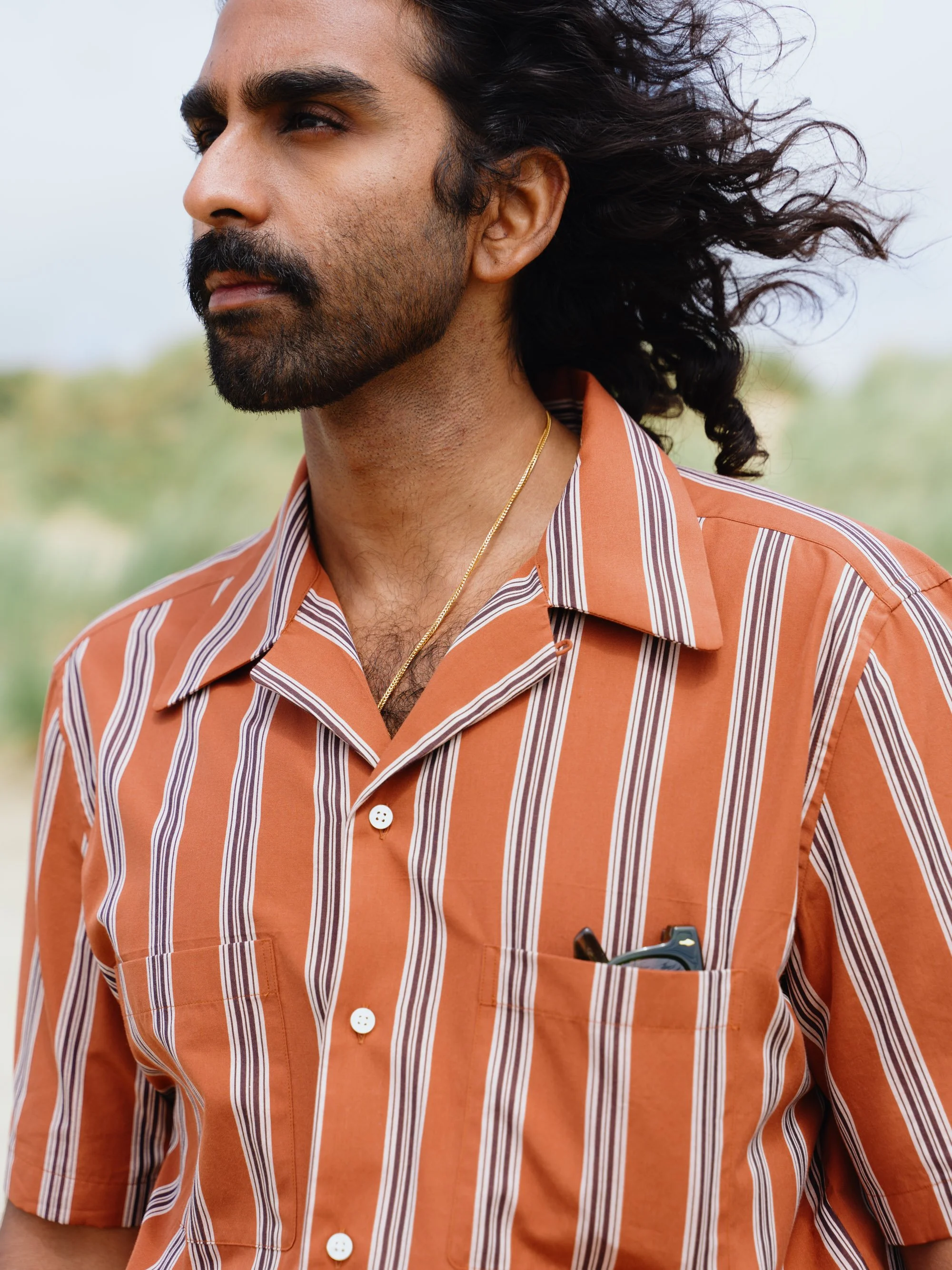 In terms of design language, the collar gracefully fans out following our pattern design and cutting, bringing out the loosened up summer flair summer as it should. This artefact introduces a relaxed, straighter shape to allow for a tank top or T-shirt layered beneath and has chest pockets on each side for your glasses and belongings. Shirt patterns are flawlessly matching to maintain subtle elegance. High split gussets are added on both ends of the garment for more action-friendly hand and pocket movements.