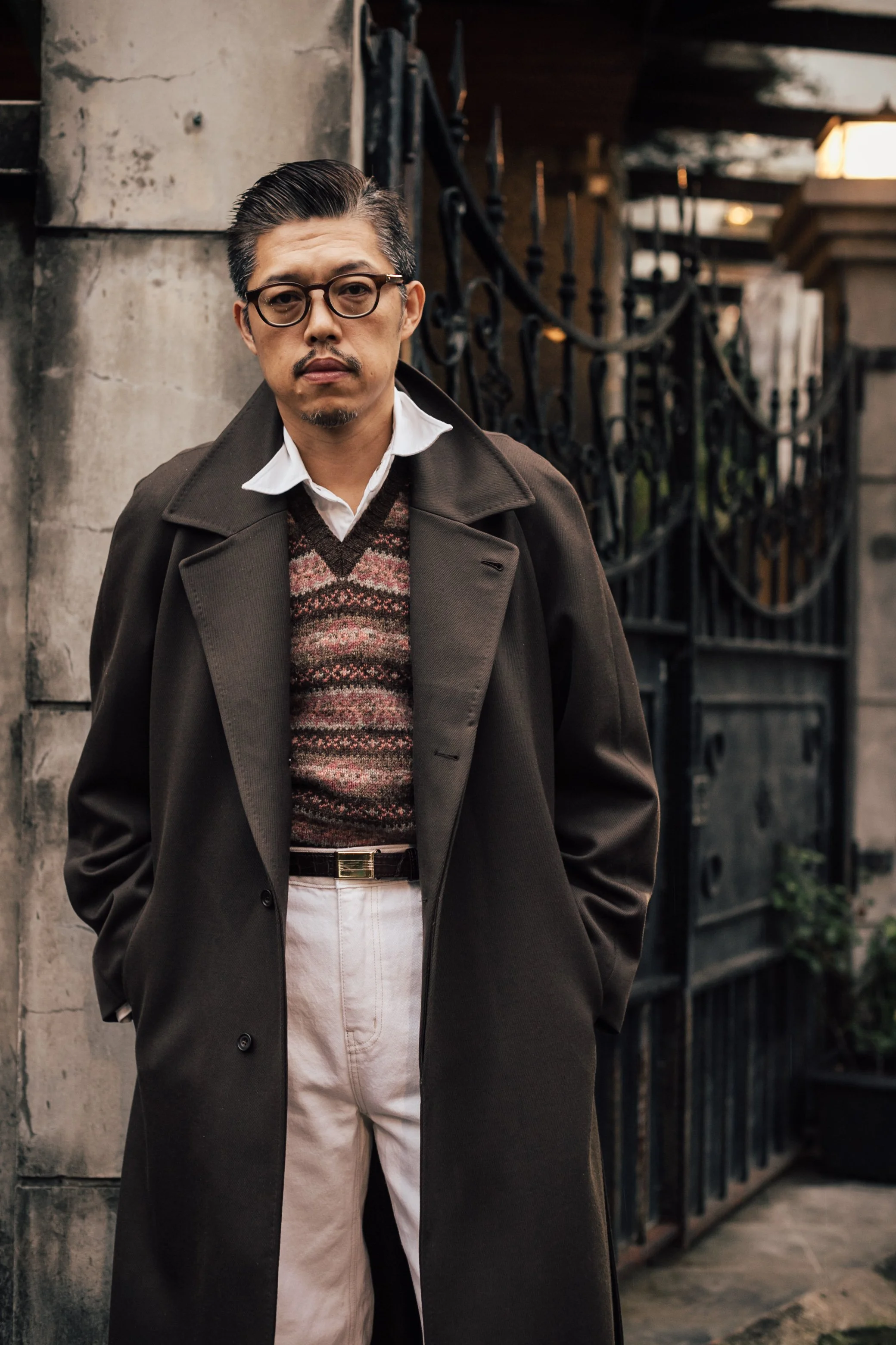 The material diverges from the typical shell or gabardine jacket, the usual raincoat type of material. Specially woven for us in a 25/26oz (700gm) British wool cavalry twill that highlights a visually enticing dual-twill feature, the dense weaving construction of the cloth is also naturally hard-wearing whilst water-repellent with no need for artificial coating. Matte and designed in a cool-tone brown, perfect for winter layering with a wide range of colours.