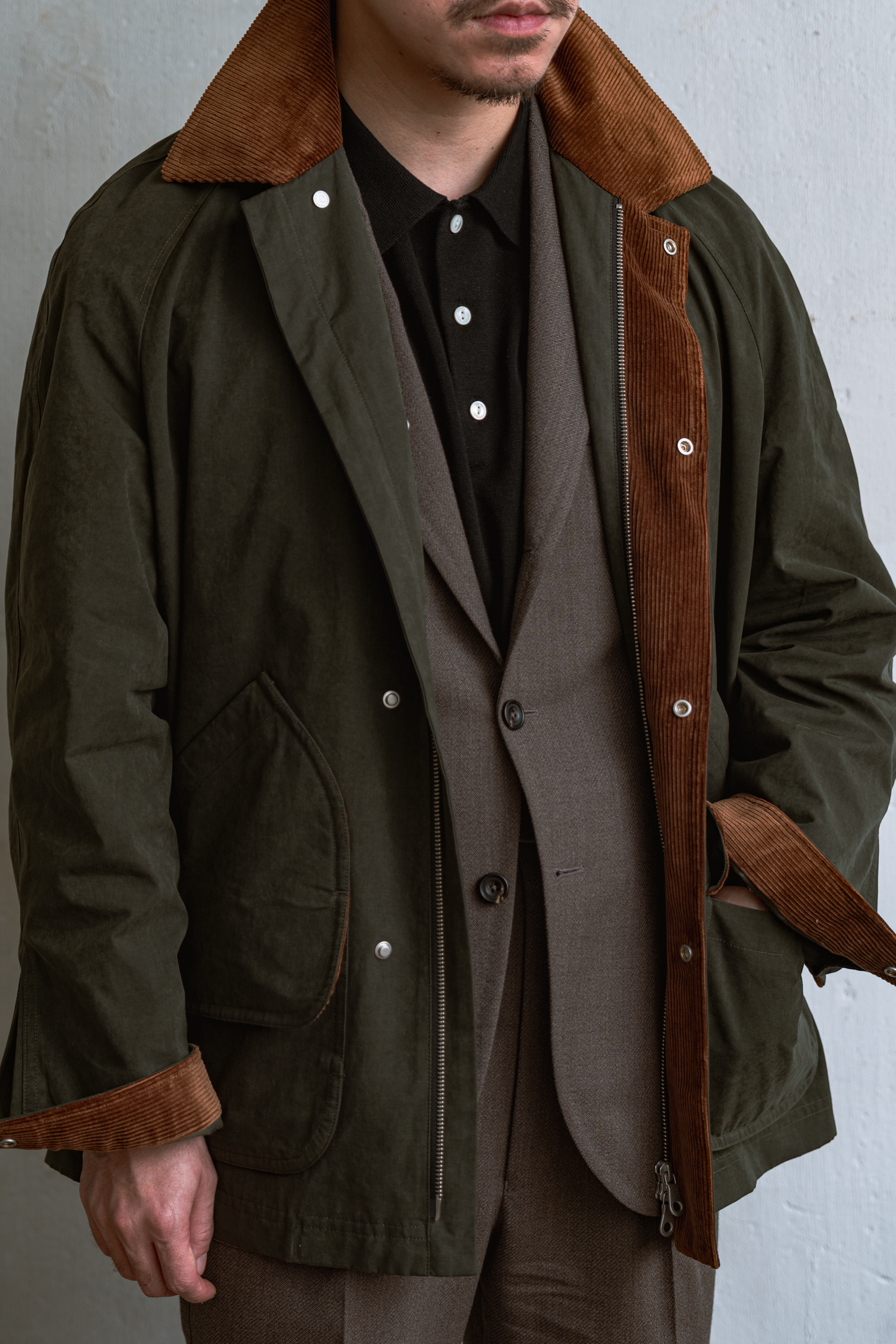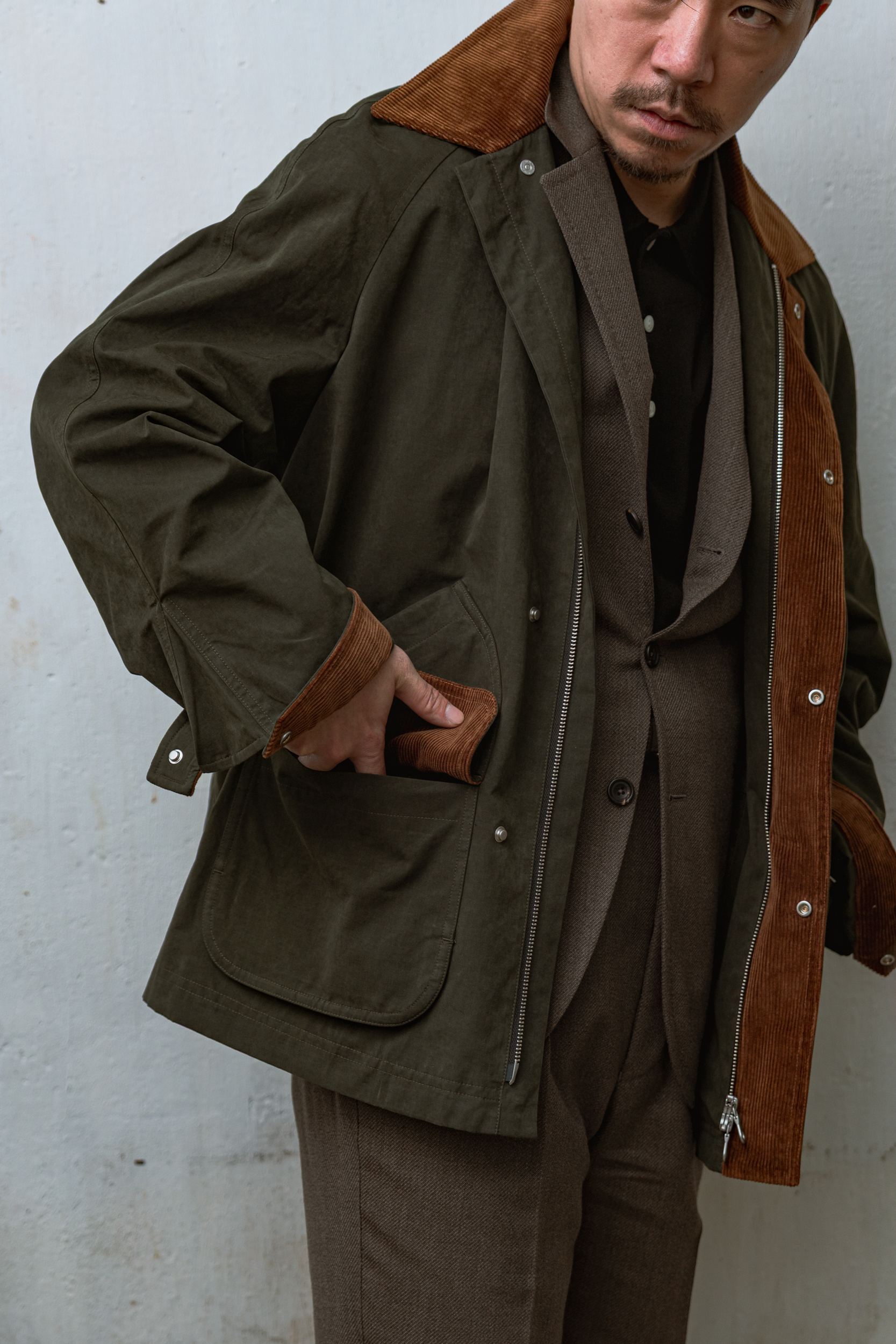 Built for movements, the jacket features a raglan-sleeve design, a robust yet straight body profile. The single-coloured silhouette is contrasted with thoughtfully placed corduroy accents on the cuffs, collar, and pocket trims for warmth and tactility. Its design combines practicality with understated elegance, achieving a balance between rugged workwear and refined style. Various pockets are equipped both externally and internally, with rain flaps also equipped for full weatherproof sensibility.