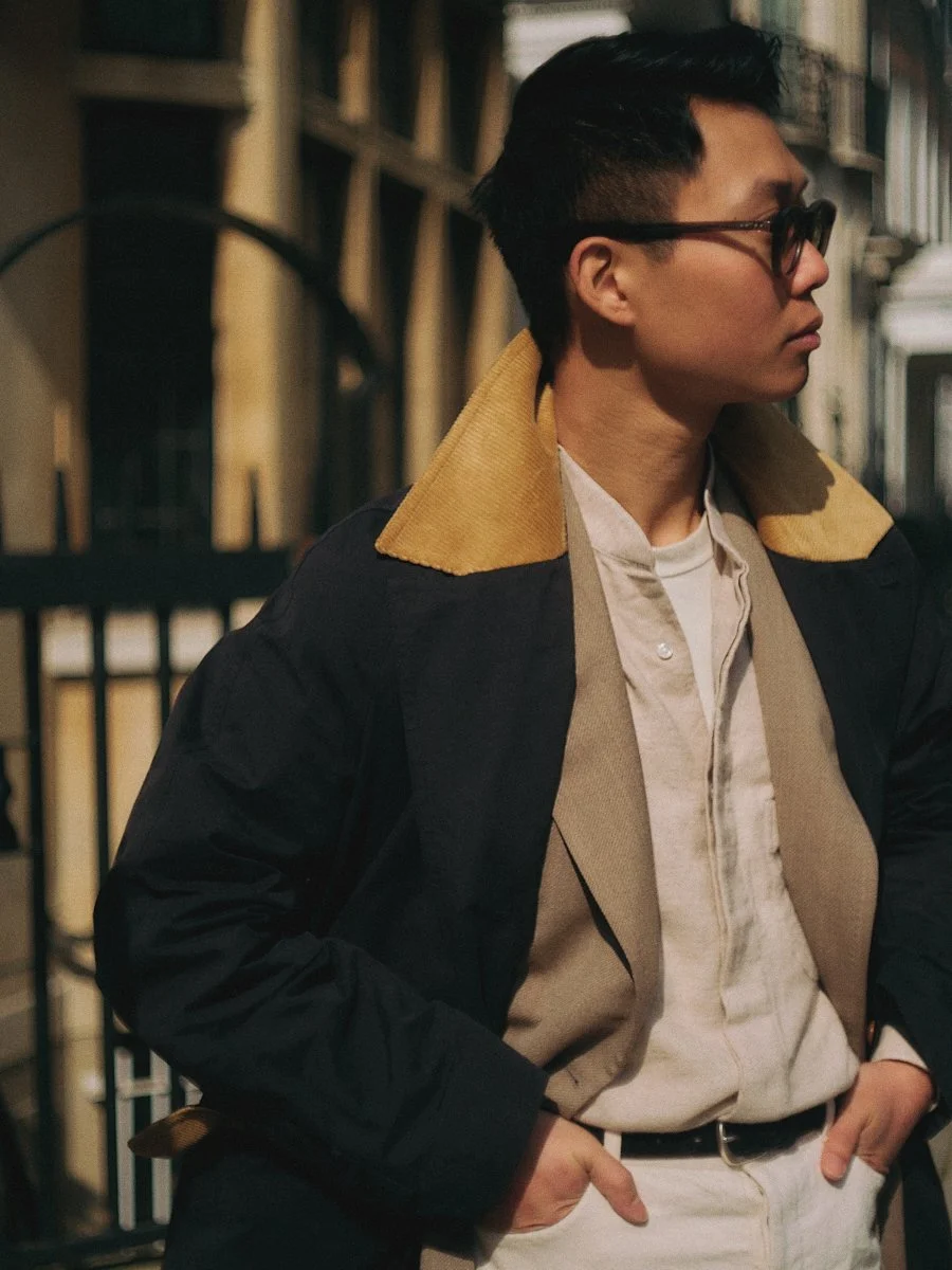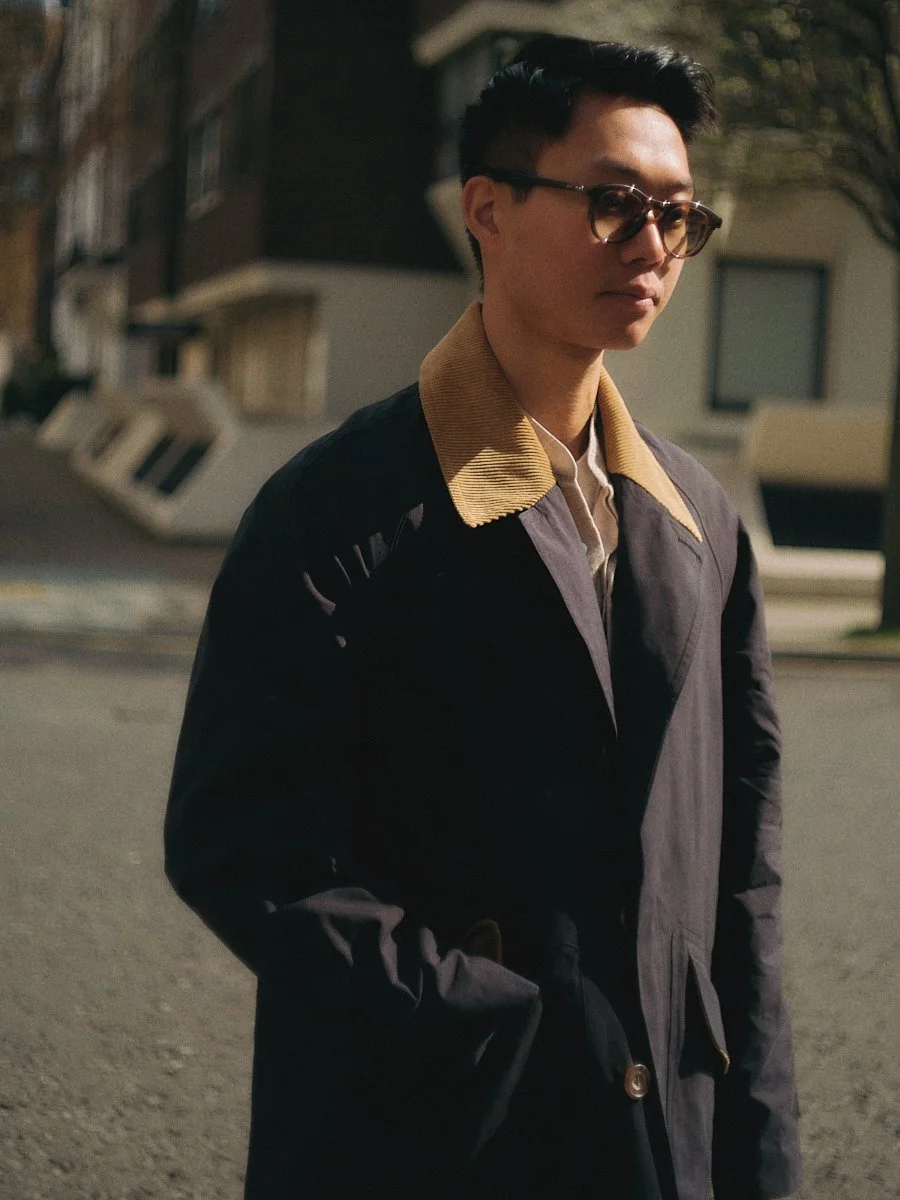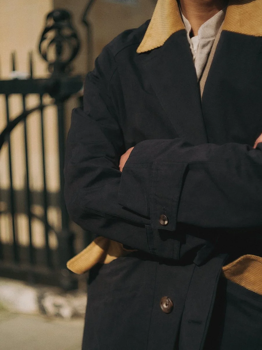 Inspired by the pulse of the city, the Technical ‘A’ Raincoat blends British timelessness with a modern light-heartedness. A modernised take with traditional inspiration from a British raincoat and a Chesterfield, the navy body gives a whimsical contrast against a pop of faded yellow, softly tailored in Italian cloth and construction, combining aesthetics and techniques with no geographical boundaries. Suited for all-function wear, this piece is designed for those who traverse the metropolis with a calm, confident stride. It embodies the spirit of urban exploration without pretence.