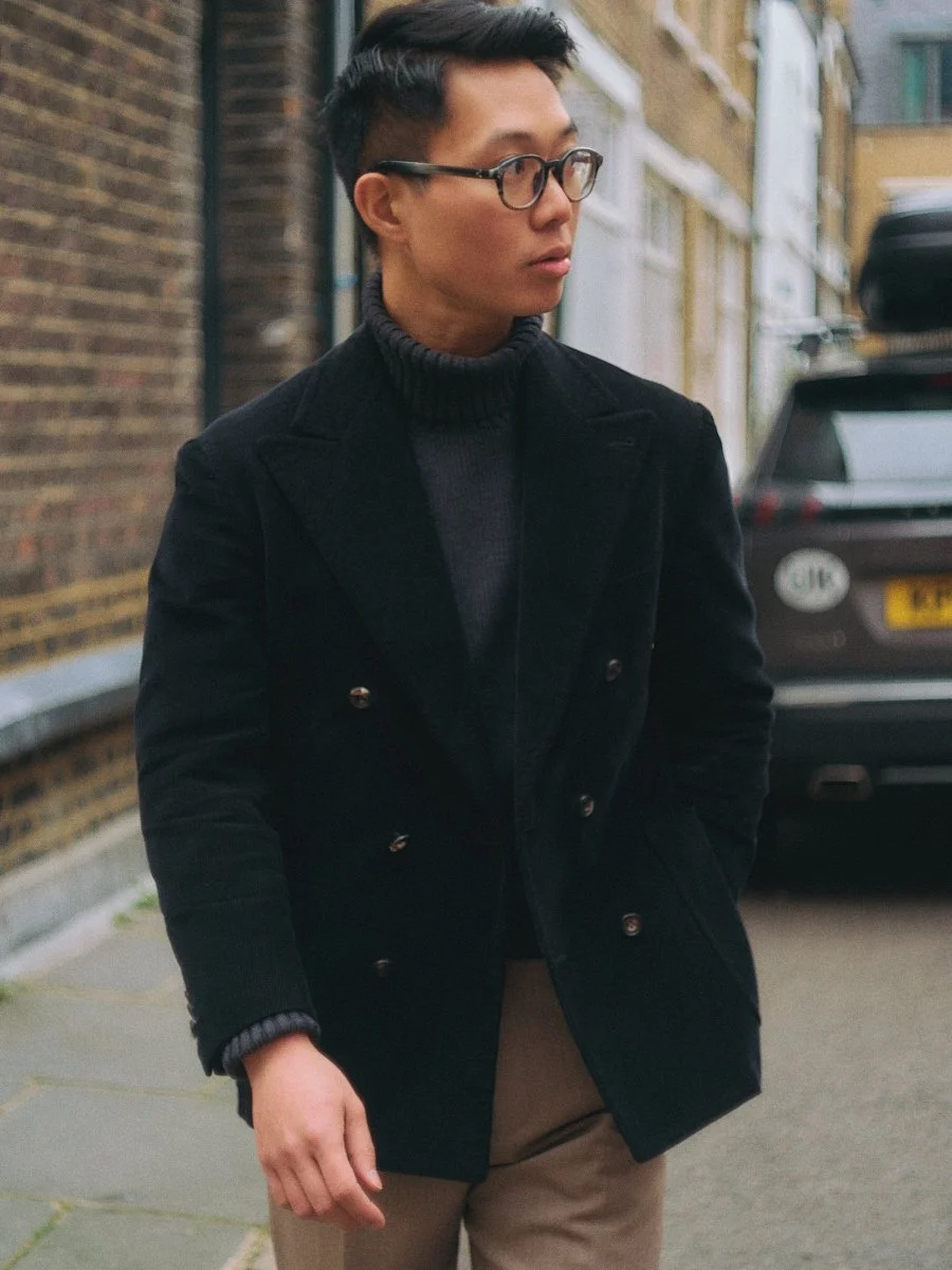 Breathing new life into black in tailoring, twisting the idea of the colour to enable usage outside of the formal settings while respectfully following tradition. It is why we experiment with corduroy, as the fabrication has historically always been an outlet for creative colours. The only distinction is, instead of going for a bright colour, we go the opposite way for a deep, sunken and light-absorbent black.