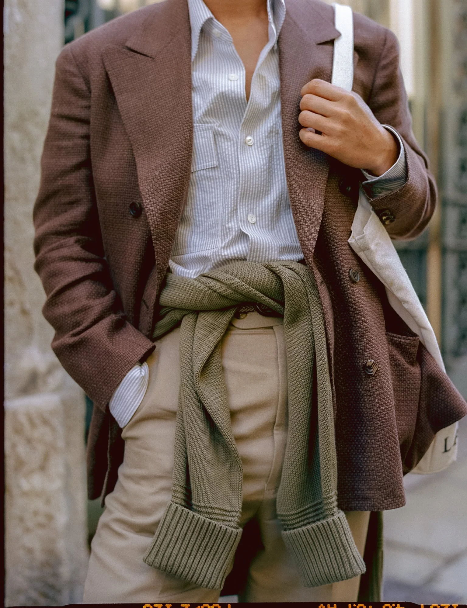 An elevated summer sport jacket designed with a strong emphasis on texture and warm-weather dressing. Woven in a refined two-by-two basketweave, this jacket draws inspiration from artisanal traditions— echoing the tactile beauty of rattan, raffia, bamboo weaving, as well as hand embroidery. The fabric is a thoughtful blend: predominantly linen for breathability and crisp structure, with wool introduced for softness and graceful drape, resulting in a garment that’s both visually rich and comfortably lightweight.