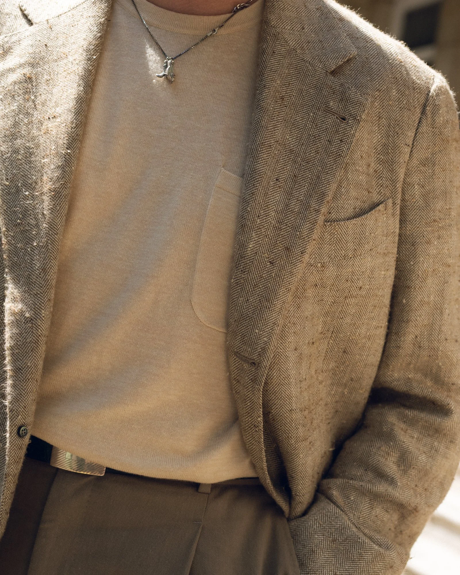 Its burnt honey shade, slightly deeper than golden tones, evokes a sense of aged elegance and natural patina. A faint pink undertone emerges through fine herringbone weaves, giving the cloth a romantic, almost hidden vibrancy. Designed without overt patterns, it speaks to those who value understated refinement and artisanal craftsmanship. Ideal for refined summer dressing, this linen-silk sport jacket is a soulful expression of quiet sophistication, effortlessly bridging comfort, texture, and visual intrigue for The Anthology’s type of dresser.