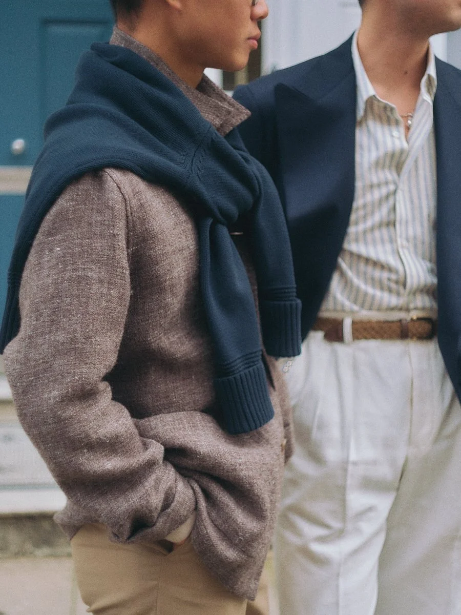 The sweater style features a simple design with specific proportions — a higher neck, ribbed sleeve and collar, shorter body and longer ribbed hem. The detail allows the sweater to hug around your trousers’ waistband without going too long or needing to be tucked in, maintaining good overall proportions even when paired with mid to high-rise trousers and sport coats.